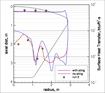 After several years work by a team of dedicated people (see here for one of them), good agreement can be obtained for low enthalpy gas cases. As shown left, these solutions require the combination of accurate numerics (dissipative numerics tend to predict too small a separated region), vibrational-nonequilibrium effects, and a very fine grid (think 250K cells minimum for an axisymmetric flow). The heating on the forebody shows a small discrepency due to vibrational accommodation that improved modeling has shown to capture accurately.