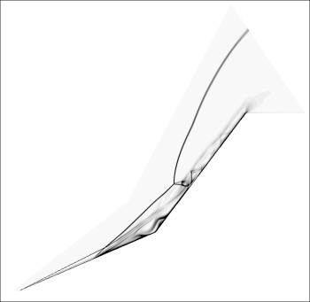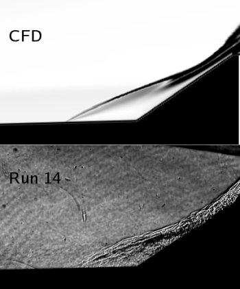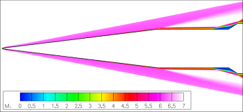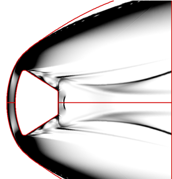 Despite its geometric simplicity, the double cone is one of the most complex flows in hypersonic aerothermodynamics. The compound angle creates a complex shock-interaction region where a change in the size of the separated region changes the angles of the intersecting shocks whch in turn changes the size of the separated region further. The computational Schlieren image to the left details all the shock interactions that occur in this type of flow. With quality experimental datasets generated at the LENS facilities in past few years, the double cone is one of the most strenuous code validation exercises.