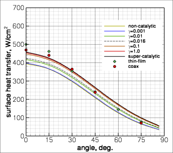 The effect of catalytic heating on the model, however, is less clear. As in the case of the CO2 testing, we measure significant catalytic heating on the models in air. Although the percentage of catalytic heating compared to the total is less than it was for CO2, the level is significant. The model predicting full-catalytic recombination (this time to pure O2/N2) again matches best in the stagnation region, though there is evidence that the level of recombination falls off as a function of angle on the cylinder. None of the constant efficiency rate models predict the heating pattern accurately.