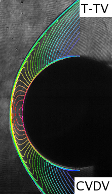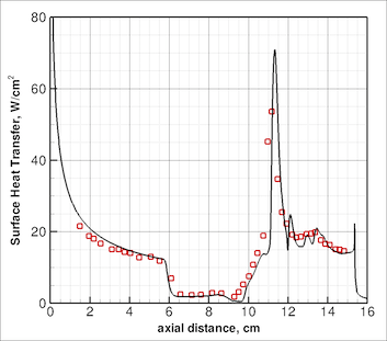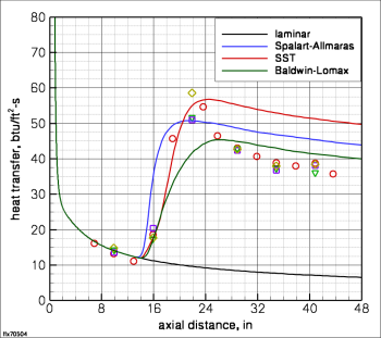 Left shows turbulent heating predictions for various RANS based models in hypersonic flow. There is a relatively wide band of solutions depending on the model chosen. Researchers who have worked with RANS models know that there are lots of "tunable" coefficients and source term modifications designed to make the models perform well for one flowfield or another. Part of my ongoing work is to work through these turbulent issues and develop an improved model that we can use to accurately predict our heating data.