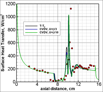 At high enthalpy, where we have chemically and thermally active flows, agreement is much more elusive. We have been working at this problem for several years and still have not resolved all aspects of the problem. Application of the lessons learned in the low enthalpy flow helps, but discrepencies with the measured data remain. In part, the thermal state of the freestream gas may be an issue. I have also done some preliminary exploration of vibration-dissociation coupling in the separated region. While this case shows little sensitivity to the coupling model, other conditions show more proounced differences. It is clear that more work needs to be done with this flow before it is understood.
