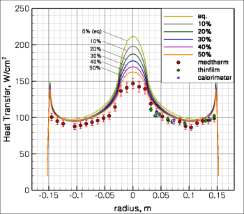 In addition, CO2 is very thermally active compared to air species and it has multiple vibrational modes that hold a considerable amount of its internal energy at even moderate temperatures. We have seen indications that the gas is very thermally active in the shock tunnel environment where the CO2 is stagnated at high temperatures and then expanded out into the test section. We see influence on shock-standoff, surface heating and pressure that is an indication of thermal non-equilibrium. As shown left, I have looked at this problem by computing the shock stand-off and surface heating patterns as a function of degree of non-equilibrium in the freestream. The highest percentage of non-equilibrium energies best match the measured data assuming complete cataytic recombination uniformly over the surface. Of course, this assumes some understanding of the catalysis problem as discussed above. This coupling of thermal modes to heating behavior begins to highlight the physical complexity of modeling this gas and our work is ongoing....