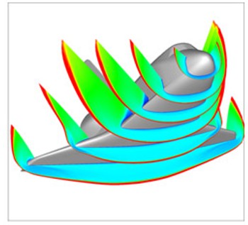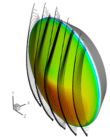 For spherical capsule (Apollo or Orion) development, I have done computations to support multiple studies of a generic capsule OML (based on the Apollo shape). I am involved in studies targeting radiation effects, real-gas effects, transition, wake flow structure, ablation, and surface roughness. Left is a typical flowfield around a capsule at no angle of attack showing the shock patterns and wake structure.