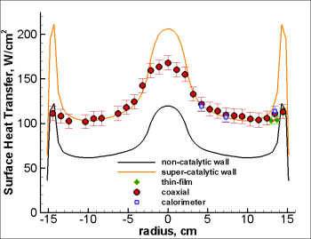 The first physical phenomenon that I have dedicated considerable effort on this program is in assessment of catalytic heating. CO2 is difficult in that it has a large negative heat of formation compared to its constituents and at high enthalpy is strongly chemically reactive. The degree acceleration of recombination on the surface is such that large differences occur between a non-catalytic versus a very catalytic surface (nearly a factor of two as shown left). Here is an example where experiment and CFD must be coupled together as only by plotting the data against the limiting bounds predicted by the CFD can one assess the data. We have seen in many of our tests at LENS a high degree of catalysis that we have investigated with different types of instrumentation, different material surfaces, etc. One on-going interest of mine is to develop physical models for these catalytic processes that explain the catalysis that we measure in the facility.