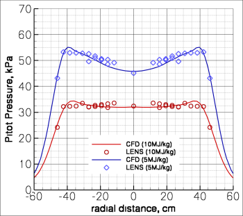 One of my most fundamental tasks is facility validation. I simulate the facility itself to assess flow quality, check out new conditions, design upgraded components, etc. Here, I have compared to measured Pitot pressure profiles at 5MJ/kg and 10MJ/kg. Pitot pressure is the first measure of facility validation. We have also compared to hemisphere probes, compared to shock shapes on fundamental geoemtries, and compared to non-intrusive diagnostics measurements of species density, temperatures, and flow velocity as part of this work.