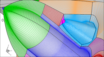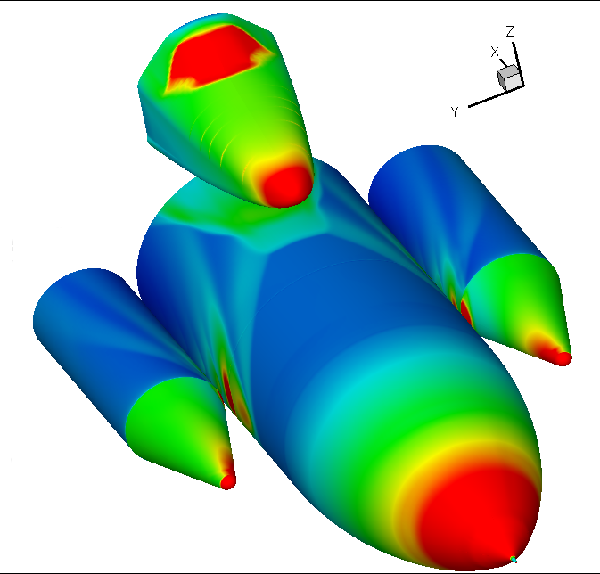 Many aspects of our work studying the Shutle STS configuration were uniquely challenging. We have done extensive work both with the ascent and descent configurations and both represent some of the more difficult grids I have had to design. I design and create all my own grids as the example of the Shuttle OTS grid to the left shows. This grid was (I think) about 15 structured blocks with about 12 million grid cells (one tends to lose track of the exact count in the madness...). It was in fact about this time that I coded automatic zonal boundary detection into the DPLR code.