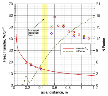 The wave(s) of maximum instability define the likelihood of transition, where the integration of the streamwise wave number is correlated to an empirical e^N fit. Pure experience has shown that N=10-12 correlates transition onset well for a variety of flows on flight vehicles, with somewhat lower values expected for wind tunnels. A major part of my work in this area focuses on analyzing experimental data to understand the transition onset process and to correlate to the PSE solution as shown left where the measurement of surface heat transfer is used to determine measured onset.