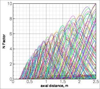 In addition to the meanflow CFD work I do, I also have a continuing interest in high-speed transition prediction. I have done significant work validating transition prediction with the STABL code (University of Minnesota). The STABL code solves the parabolized stability equations (PSE) for the growth of first-mode and second-mode disturbances. Using a chemically-reacting mean-flow solution, sets of test points are evaluated by marching downstream from an initial solution of linearized PSE equations. Each test point grows or decays depending on its compatibility with the 1st or 2nd eigenmode of the laminar flow. The resulting growth (plotted left) shows the waves grow according to their degree of instability.